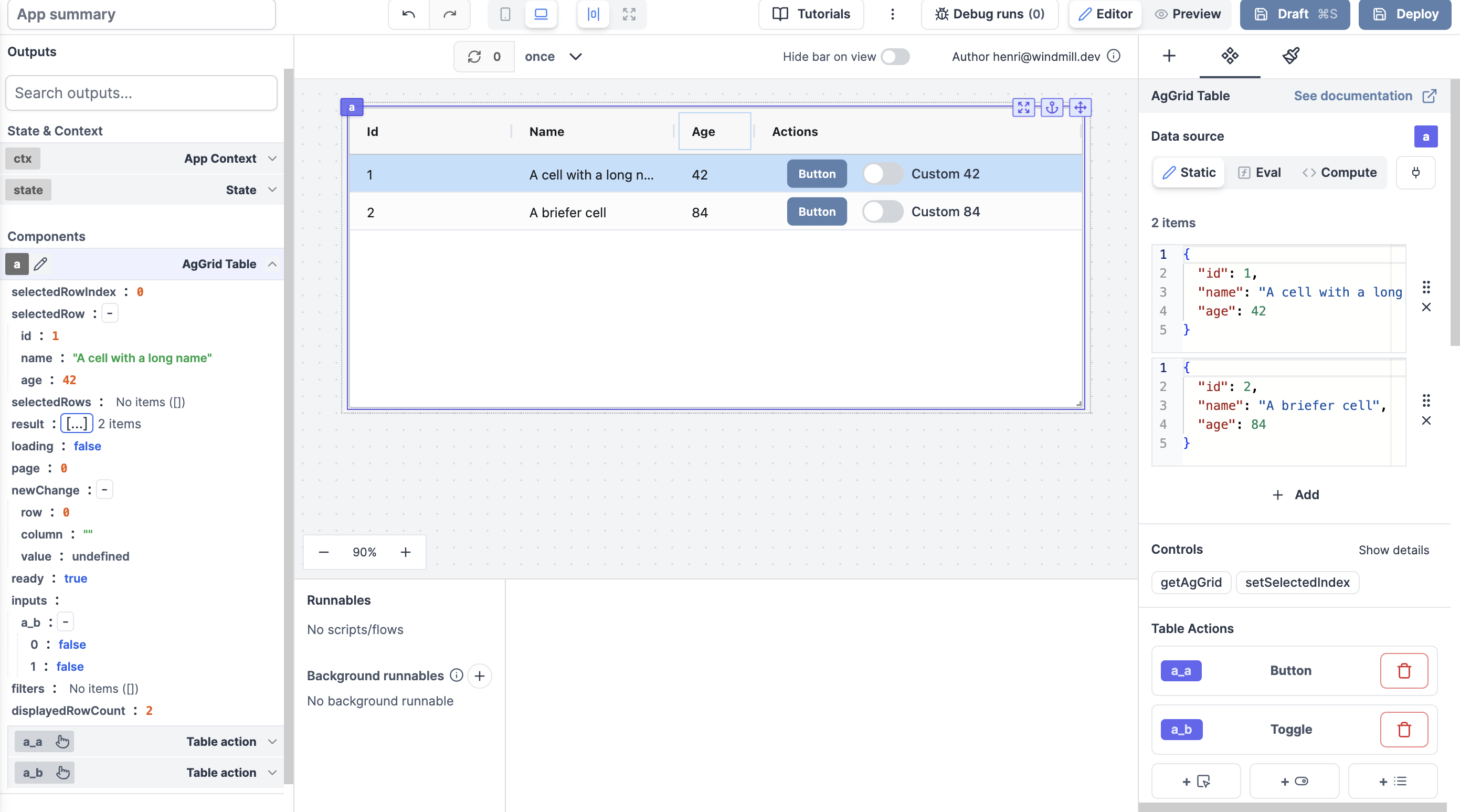 AgGrid and Database studio rows now support actions, components that will be displayed at each row of the table.