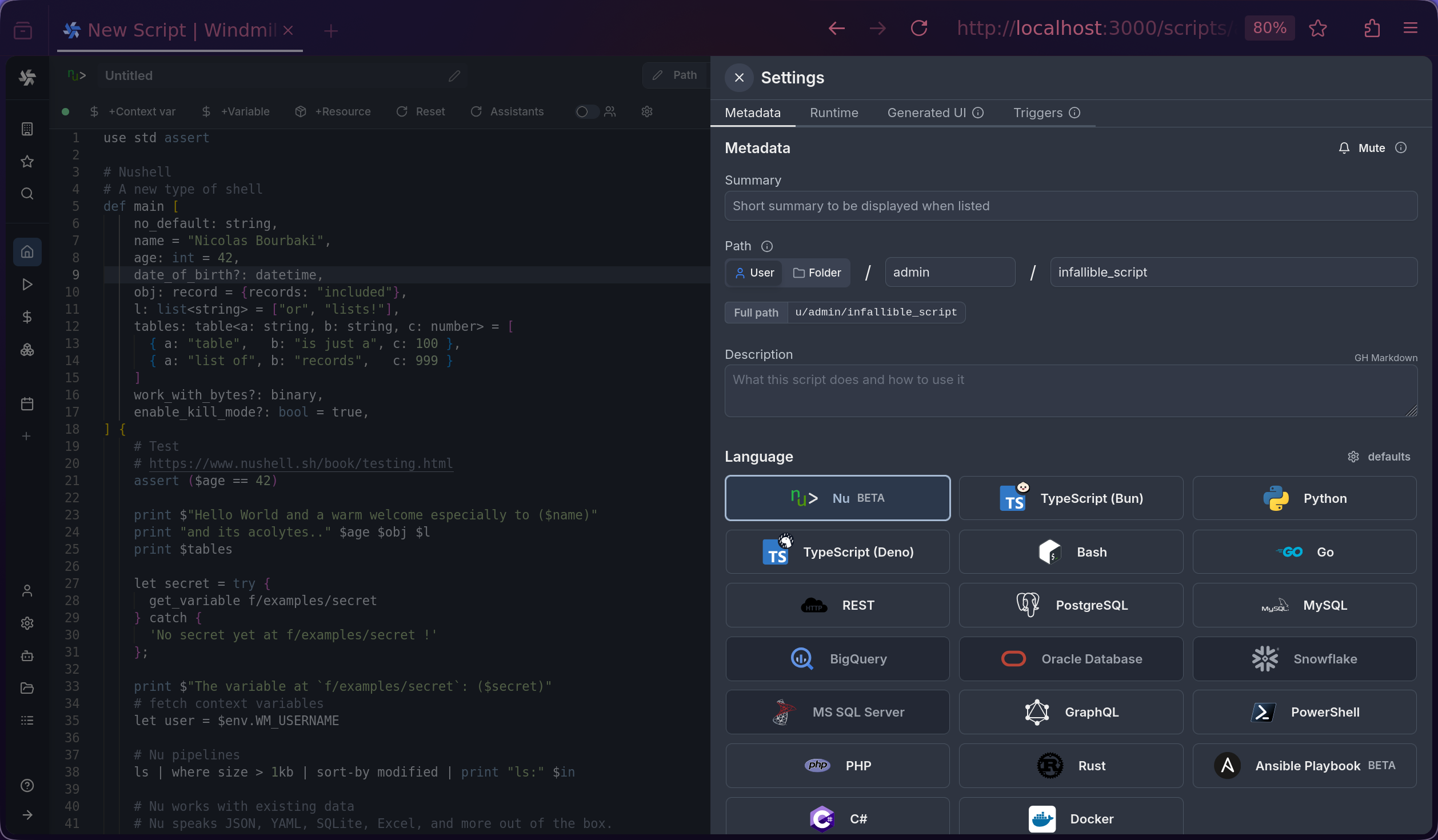 Windmill provides a true NodeJS compatibility mode using Bun. This means that you can run your existing NodeJS code without any modifications. Only comment //nodejs on the first line of your Bun script.